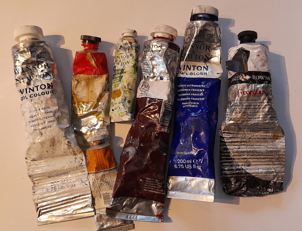 • The following oil paints : burnt umber, cadmium red, yellow ochre, black, white